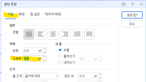 [서식] - [문단 모양]에서 (단축키 Alt + T )