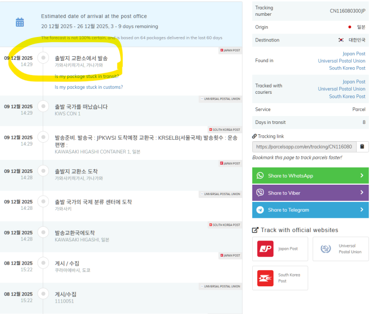 12월 8일 일본에서 도쿄 쿠라마에바시 우체국에서 접수되어 12월 9일 일본을 떠난 것으로 나옵니다. 항공과 마찬가지로 항구내에는 여러 절차가 있습니다. 따라서 출발했다고 바로 한국으로 오는 것은 아닙니다.