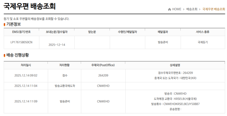 해당 배송은 EMS가 아닌 국제준등기로 우체국 배송망을 이용해서 배송합니다