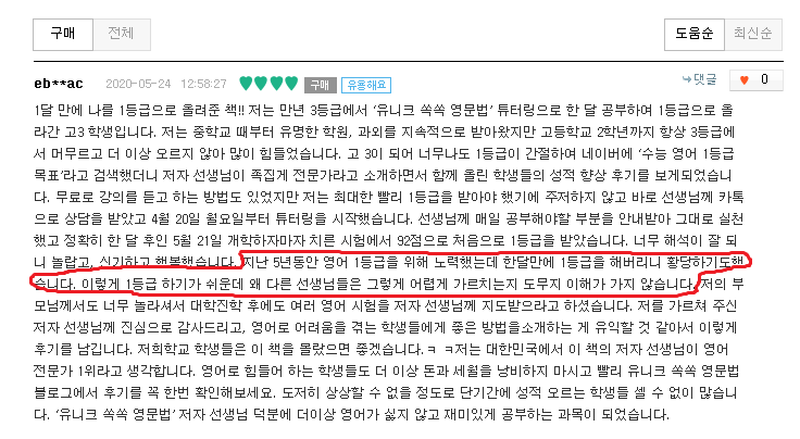 고3. 2등급 1달 수강하여 내신 1등(98점), 수능 1등급(성적표 확인 요망)