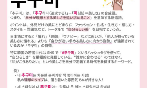 추구미[chugumi] 最近韓国で流行っている言葉です。もしかして聞いたことがありますか? 「추구하다 追求する」の「추구 追求」と美しさを意味する漢字「美」が合わさった言葉です。 簡単に言うと「私が望むイメージ」を指す言葉です。 自分の好きな好みを表現する時に使います。 (추구)하다 追求する + 미 美 = 추구미 ネットショッピングモールで「추구미」を探してみようか? 이 바지는 내 추구미야. このズボンが私の追求美です。 노래 너무 좋다, 내 추구미야. この歌、すごくいい!私の追求美です。 自分のファッションスタイルから理想のタイプまで、すべて「추구미」として