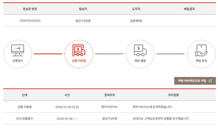 메인 화면이나 [예약/조회] 메뉴에서 **[택배조회]**를 선택하신 후, 운송장 번호 255873092635를 입력하고 조회하시면 현재 택배가 어디쯤 와있는지, 그리고 예상 도착일이 언제인지 가장 정확하게 파악할 수 있답니다.